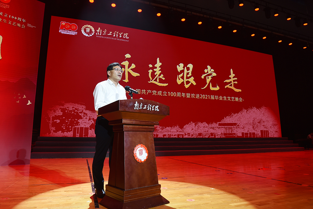 张仰飞副院长为晚会致辞。他说,今年毕业季恰逢中国共产党成立100周年,今天的晚会不仅是毕业生与母校的告别,更是毕业生们代表南工程青年向党献出的诚挚贺礼。他对圆满完成学业的毕业生同学们表示诚挚的祝贺,向为学子成长成才付出辛勤工作的老师们表示衷心的感谢。他希望毕业生们在个人成长与国家发展的同频共振中立大志、明大德、成大才、担大任,永远铭记相逢是缘、相逢有情、相逢有歌,让师生情、校友情在心中永存!