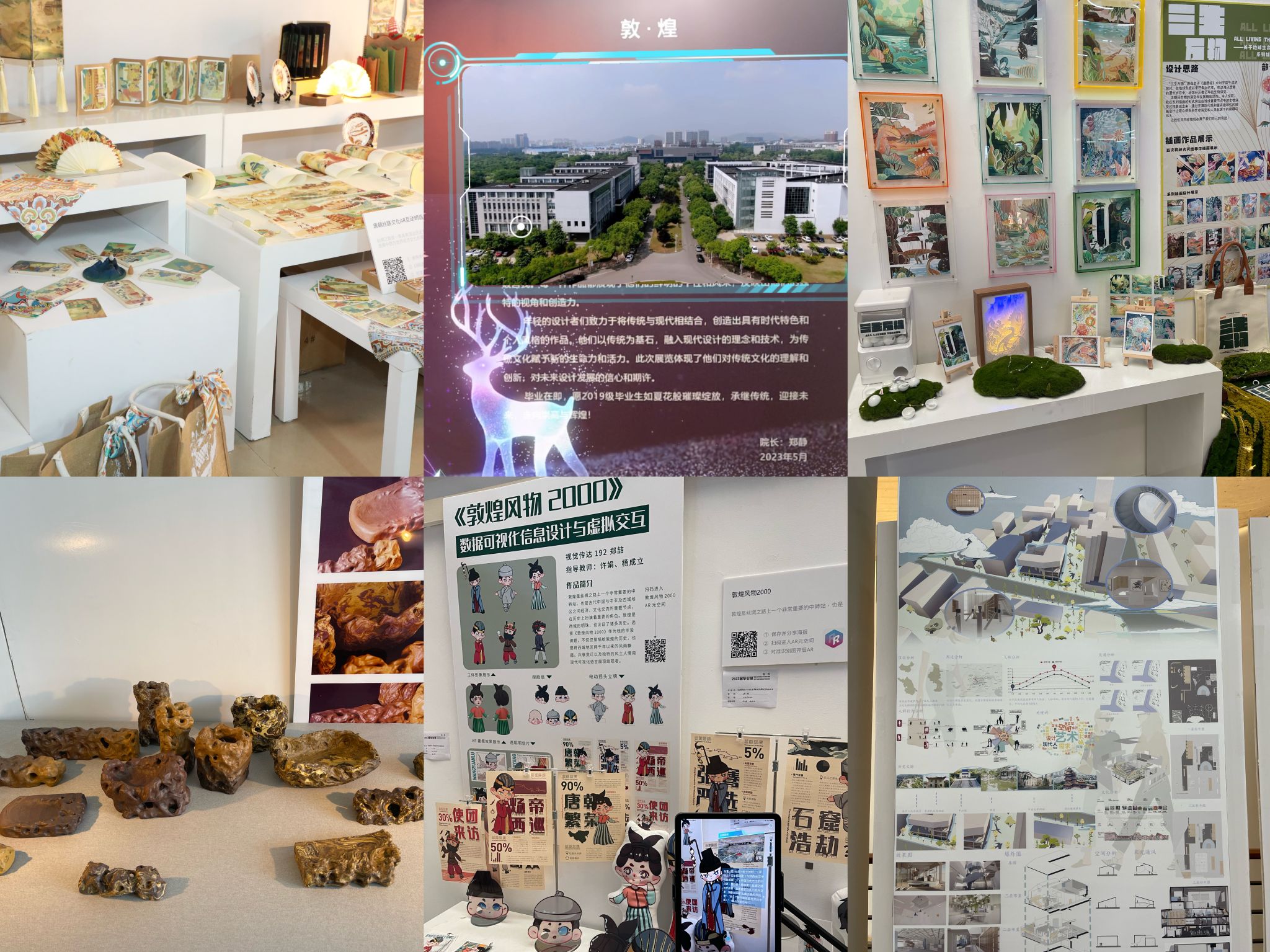 本次毕业展共汇集产品设计、工业设计、视觉传达设计、环境设计、动画、工艺美术六个专业267位学生的设计作品。作为全院师生和校内各部门共同瞩目的活动名片,展览关注社会发展前沿,关注文化发展脉络,关注城市空间改造与提升,跨越专业界限,链接艺术与科技、传统和当代,大胆创新,呈现了一场敏锐又炫酷的视觉盛宴。产品设计191班付润苗的作品《适应绿洲防季节风与水汽收集智能装备创意设计》采用了仿生设计,利用智能控制系统实现动态调节防风墙形状、方向和密度,以保护沙漠绿洲免受季节性风害并且将部分风能转化为动能,具有较高的智能化水平和实用性;视传191班张梦娇从弘扬传统文化角度出发并融合现代数字媒体艺术,围绕《诗经》中情感意象进行视觉创新设计,根据每首诗的情感基调搭配背景音乐及音效形成专属视频,在运镜的同时加入诗句,达到视觉和听觉双重结合,为人们勾勒出一幅幅上古时期人民的生活画卷,带领人们一起领略千年前人们的爱恨与家国情怀;环艺192班谢子漩的作品《敦煌壁画乐器主题展陈室内设计》,通过对敦煌壁画乐舞图像中乐器的调研,设计出了一个以敦煌乐器文化为主、敦煌乐舞图像故事为辅的主题博物馆。