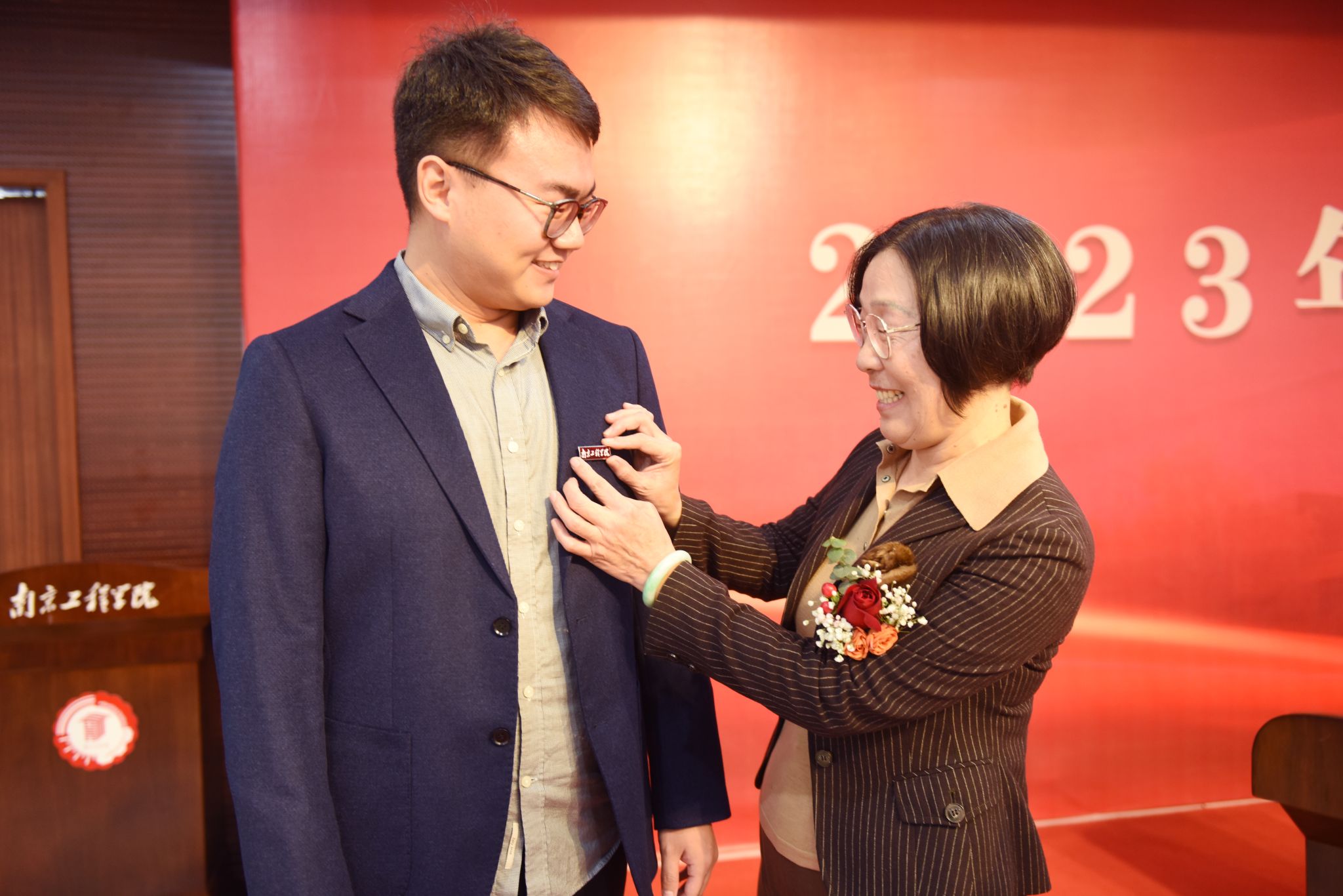 荣休仪式现场还举行了“师者传承”仪式,荣休教师代表为新进教工佩戴校徽,勉励青年教师躬耕教坛,潜心育人。