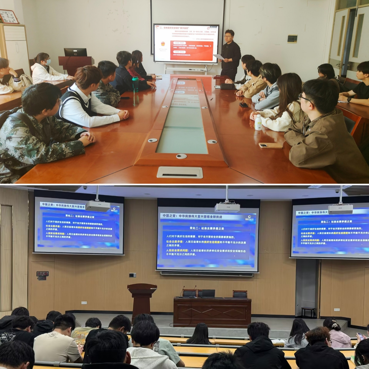 线上线下营造浓厚氛围。保密委员会办公室利用校园电子屏循环播放国家安全教育主题宣传片,动员各部门官方微信公众号集中转发,并在校园醒目处张贴国家安全海报。法律事务办公室制作《宪法》《国家安全法》等宣传展板,会同区司法局、区法学会等单位面向学生发放法治安全主题宣传页500余份。普法活动还设计了国家安全主题有奖问答环节,切实提升了广大师生的法治安全意识。人武部组织全体师生,通过中国大学生在线官网、视频号、微博等直播渠道,观看 “千万高校学生同上一堂国家安全教育课” 主题公开课,引导师生感受国家安全工作成果,推动关心、维护国家安全成为师生的思想共识与行动自觉 。