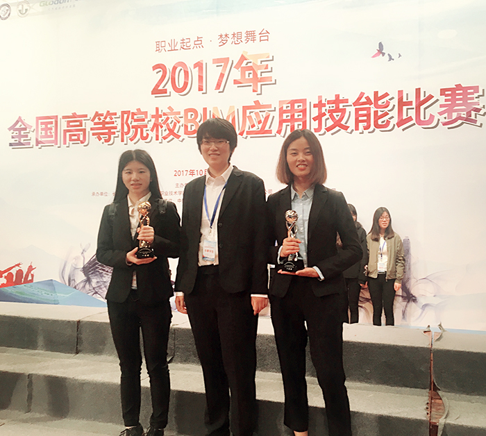 10月27-29日,2017年全国高等院校BIM应用技能比赛总决赛在长沙理工大学和江苏建筑职业技术学院进行。我校代表队喜获BIM造价应用技能大赛团队全能一等奖和建筑工程BIM计量与计价专项一等奖。本次大赛由中国建设教育协会主办,是全国高等院校共同参与的大型竞赛类活动,获得了建设行业主管部门、参赛院校及用人单位的的认可。赛事于今年4月份启动,历经校内选拔赛和全国总决赛两个环节,历时半年。全国251所高校800余名选手参加比赛,其中本科组共有198所。经过激烈角逐与比拼,由我校林敏、李燕等老师指导,经济与管理学院工管141张巧、吴慧莹和造价141余少云组成的造价应用技能代表队“凌绝队”获得算量组团队一等奖和建筑计量与计价单项一等奖。