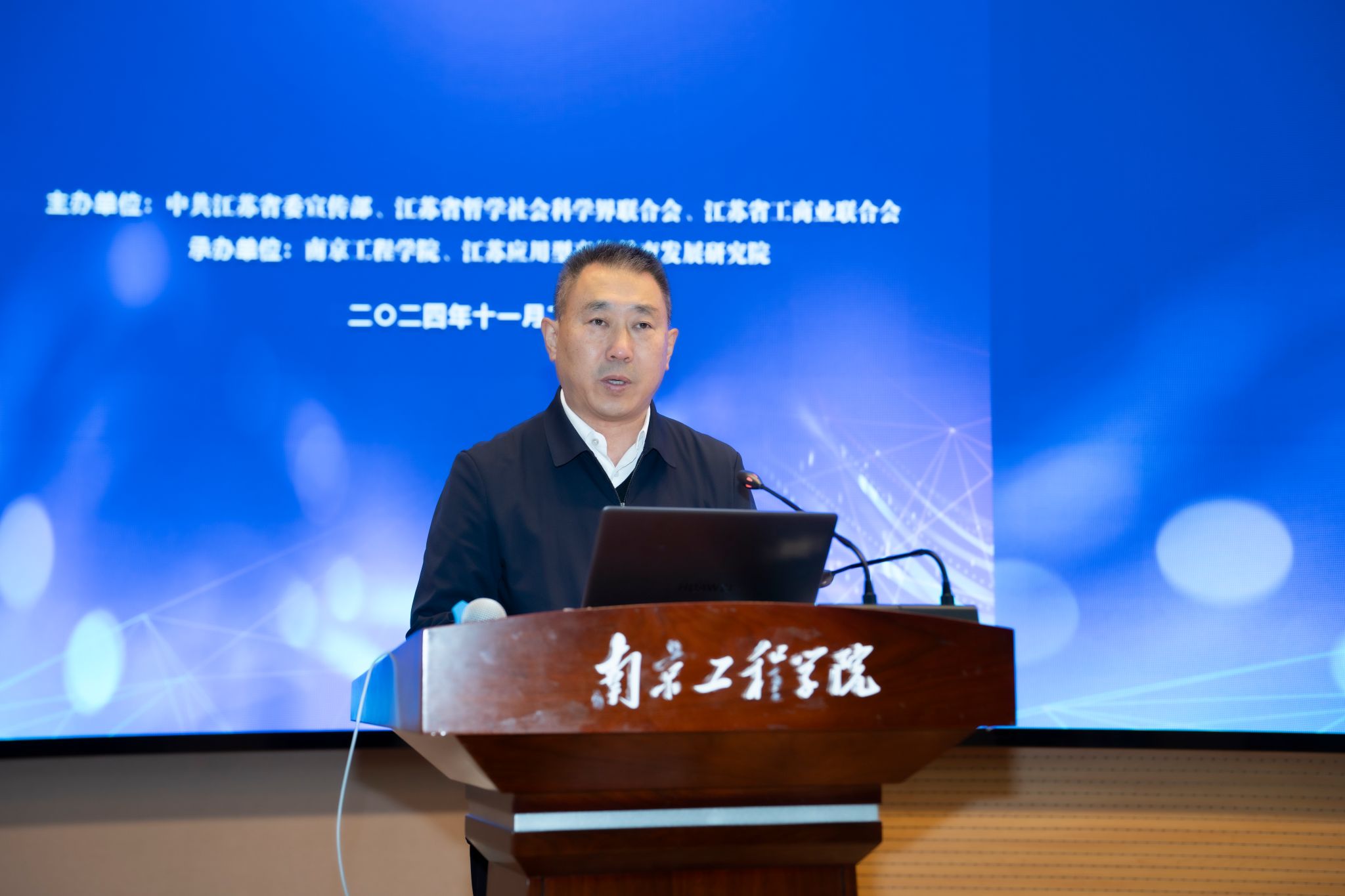 孙爱武为开幕式致辞。他代表凯发向与会领导、专家学者及同仁的到来表示热烈欢迎和衷心感谢,并介绍了我校的办学理念,以及在工科与社会科学融合方面取得的显著成果。孙爱武表示,南工程始终肩负着培养应用型创新人才、服务国家的使命,始终坚持立足江苏大地,紧扣时代脉搏,坚持问题导向,深入探索当前经济社会发展中的重大理论和现实问题。希望以此次学术论坛为契机,与各界专家学者和同仁加强合作交流,不断提高学术研究的前沿性和实用性,推动学科间的协作和融合,凝聚更多创新思想,为江苏现代化建设贡献力量。