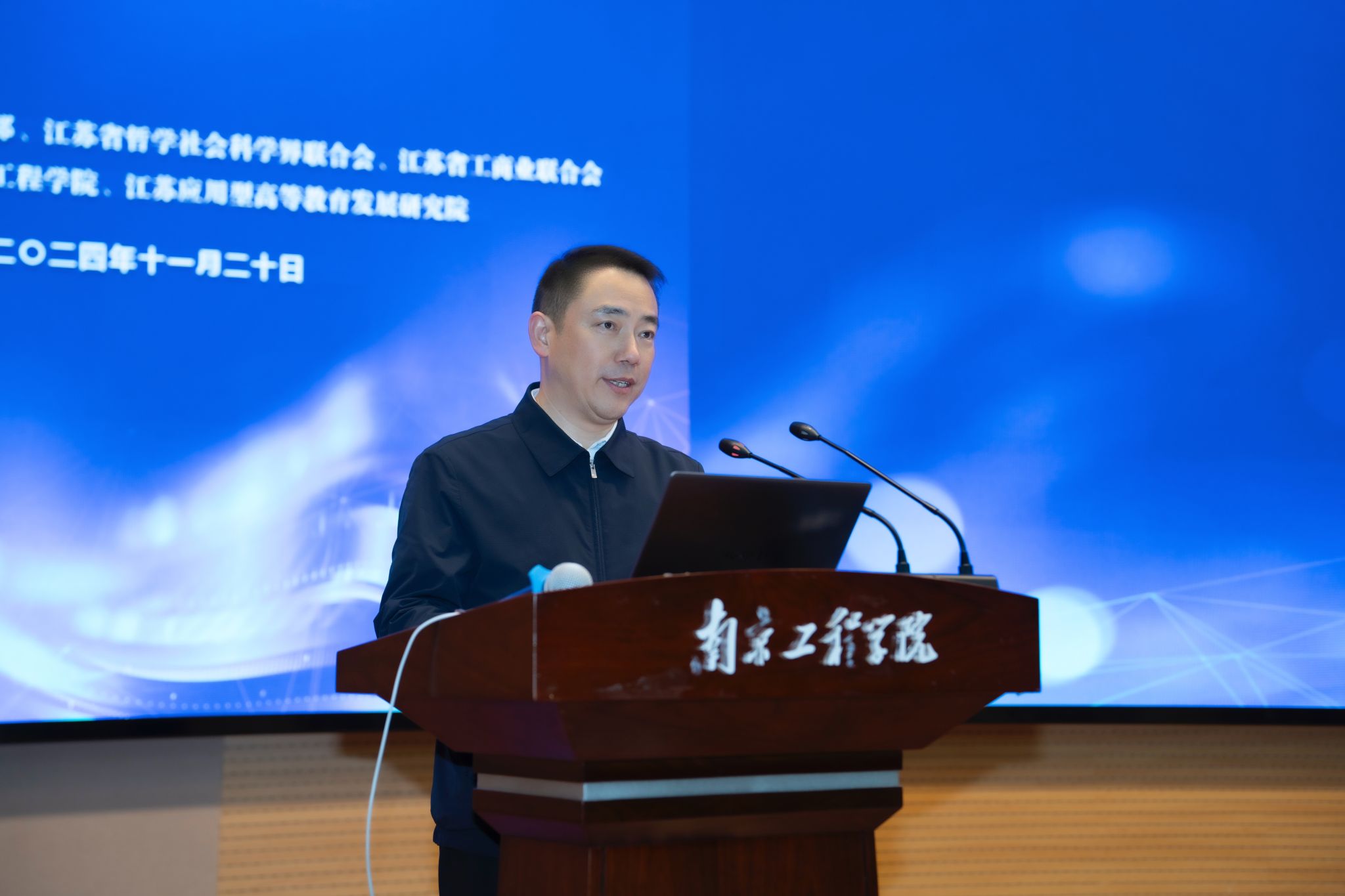 为深入学习贯彻习近平新时代中国特色社会主义思想,全面贯彻党的二十大和二十届三中全会精神,全面落实省委十四届七次全会精神,11月20日,由中共江苏省委宣传部、江苏省哲学社会科学界联合会、江苏省工商业联合会主办,凯发k8官网、江苏应用型高等教育发展研究院承办的江苏省社科界第十八届学术大会学术聚焦专场在我校举行。省社科联党组书记、常务副主席张新科,省工商联党组成员、副主席郭东升,省社科联党组成员、副主席刘西忠,省社科联组联中心主任王淑芬,我校党委书记孙爱武,党委副书记、校长张仰飞,党委常委、副校长汪群,党委常委、副校长陆华良,东南大学首席教授、经济管理学院原院长徐康宁,长江产业发展研究院特聘研究员、江苏省民营经济研究会创会秘书长、中国民营经济研究会理事吴跃农,南京康尼机电股份有限公司总工程师史翔,金陵金箔集团董事局主席江楠等出席开幕式。开幕式由张仰飞主持。