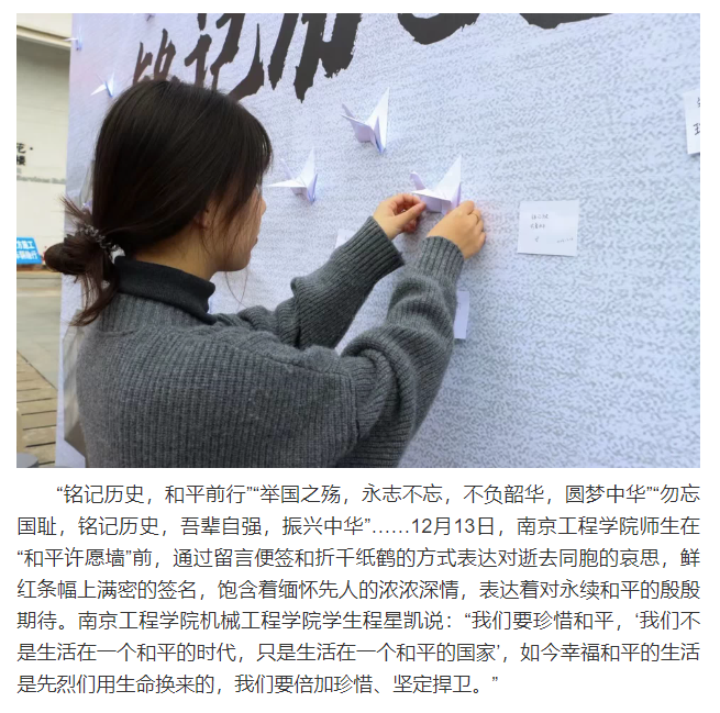 12月13日上午10:01,防空警报在南京上空响起,全城为南京大屠杀30万遇难同胞默哀。第十个南京大屠杀死难者国家公祭日之际,南京各高校开展各类纪念活动,寄托哀思,祈愿和平。
