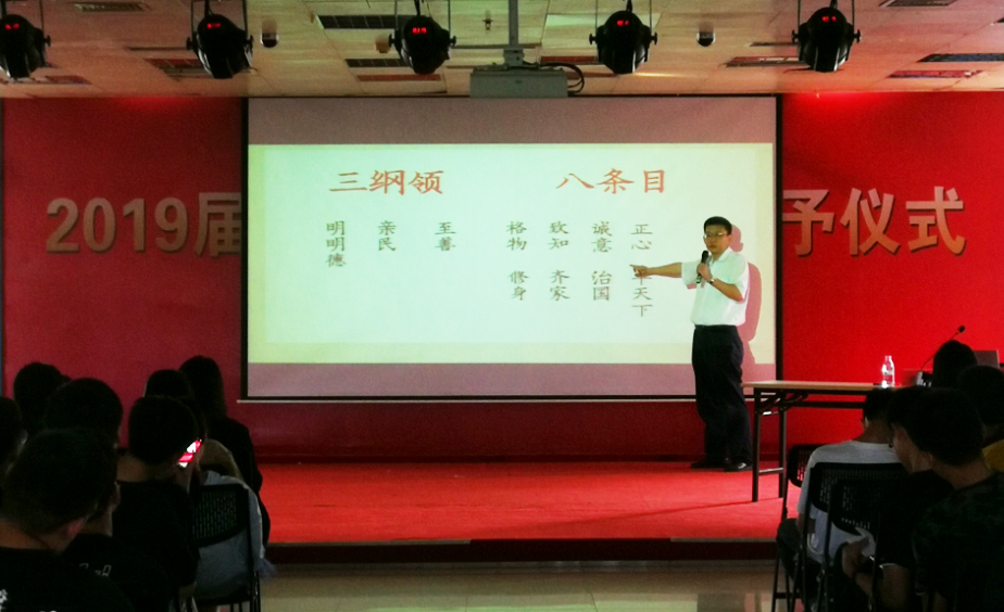 讲座伊始,周老师从传统文化的起源开始,向大家讲解 “传统文化”和“国学”的概念、“儒家思想”的历史意义和“《四书五经》”的概念。他以大学生关心的问题作为切入点,围绕什么是《大学》、《大学》的要义与精神定位、《大学》里提及的学习方法等三个方面进行深入解读。在带领大家一起诵读《大学》后,周老师勉励同学们学习态度一定要“诚意正心”,学习方法务必“格物致知”,方能具有“日日新”的创新意识,达到“止于至善”的人生境界。