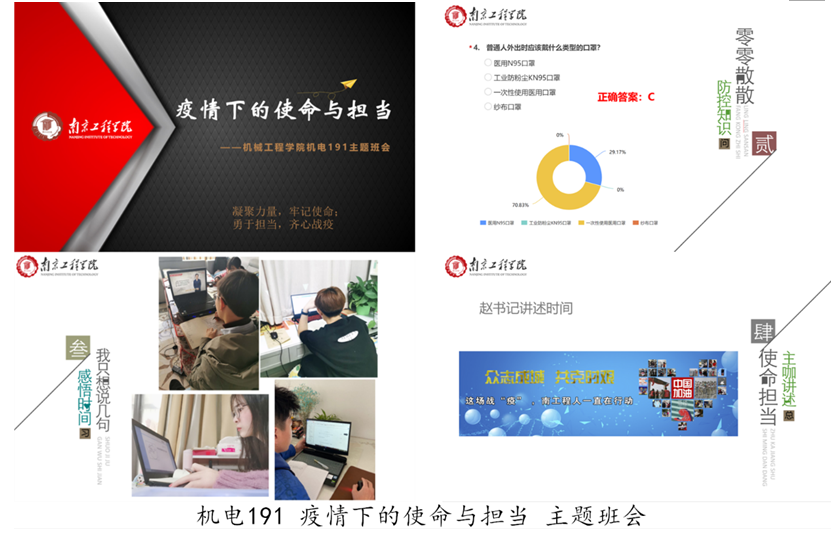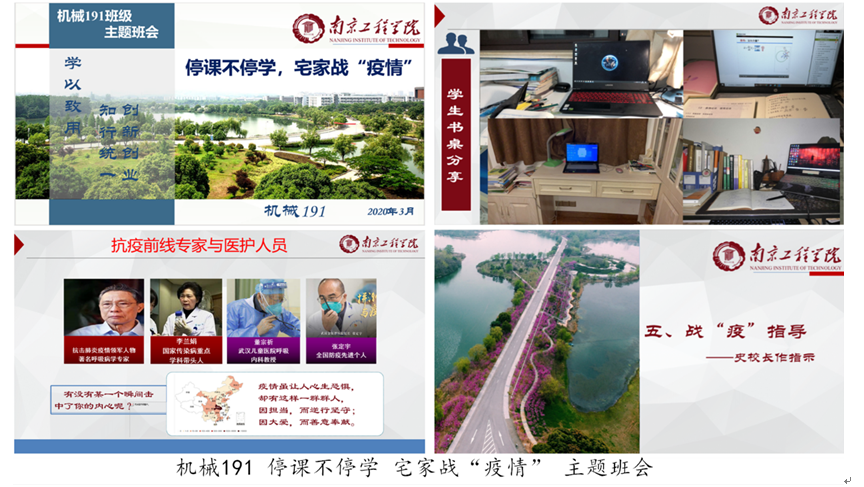 本次云端班会围绕“齐心战疫 青春有我”的大主题,各班主任、第二班主任积极担当策划人、主讲人。机械191集中学习了凯发在疫情防控期间的政策部署以及医护、基层工作者的感人事迹。该班第二班主任、我校史金飞院长还从老师、家长的角度与同学们分享了疫情期间居家学习的注意事项,特别强调良好生活规律和自制力的重要性,希望大家继续加强防控意识,注重个人的卫生安全和身心健康。同学们还结合个人感受,就目前线上、线下学习的不同特点开展讨论,大家表示线下学习氛围好、互动佳,而线上学习则内容丰富、可以回看,各具优势。大家一致认为,应该做到线上线下同节奏,把网课上好。