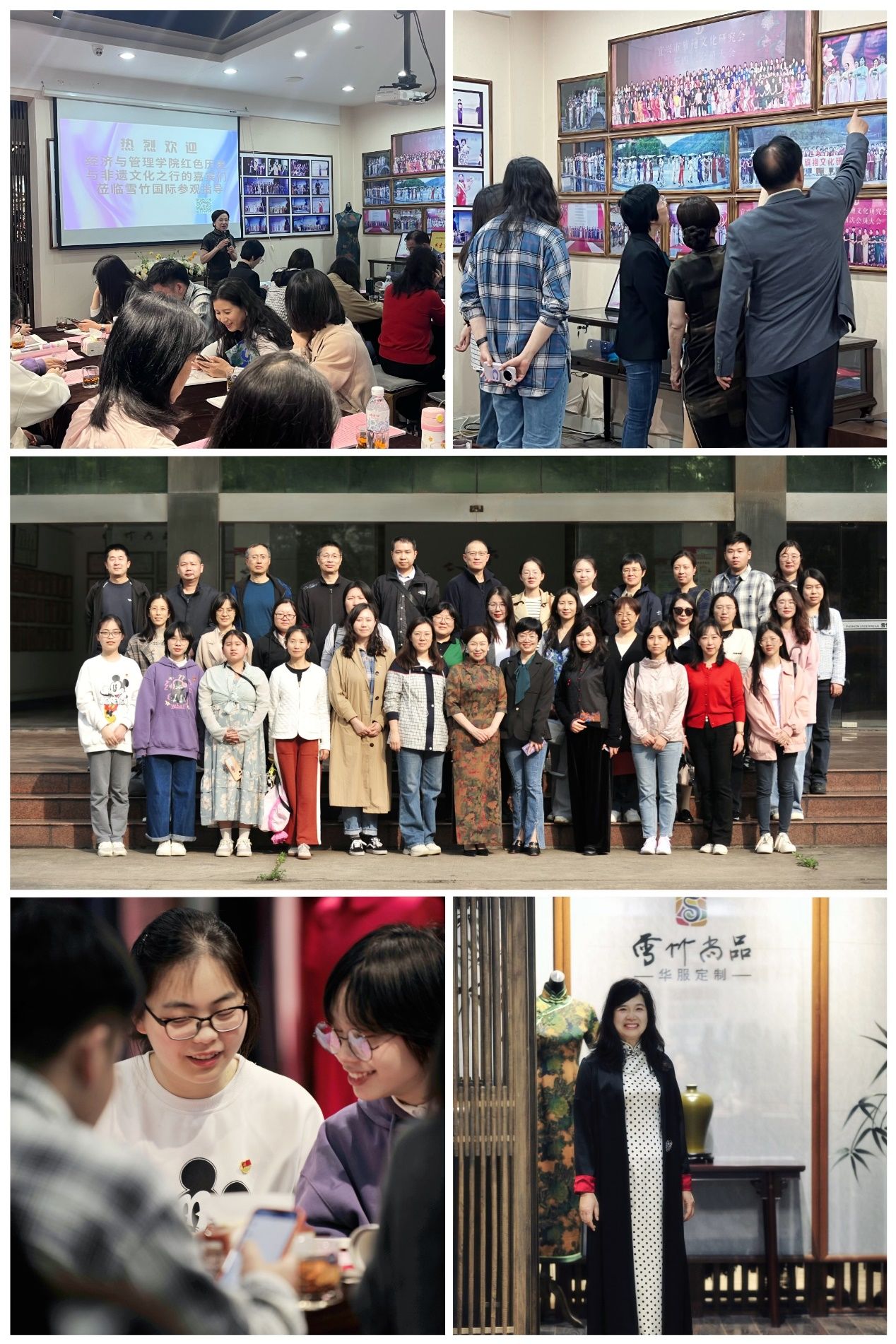 体验非遗魅力,领略中华经典。午后,师生一行在宜兴市旗袍文化研究会会长、江苏新雪竹国际服饰有限公司董事长史建珍,江苏省旗袍会创始会长戴中礼,宜兴市旗袍文化研究会秘书长蒋惠群等陪同下参观了解旗袍文化及非遗制作工艺。“旗袍不仅是一种服饰,也是传承中华文化的华美符号,它有着丰富的内涵和外延”,史建珍董事长从旗袍的历史演变、旗袍礼仪与文化、旗袍日常穿着技巧、雪竹尚品旗袍品牌发展历史等方面一一进行讲解交流。师生们沉浸在旗袍韵味的体验中,兴致勃勃地拍照留念,他们希望能将旗袍文化“请”进大凯发园,在传统美学文化传承中增强师生的文化自信。活动中,双方还就校企共同推进文化品牌建设、携手助力产业链发展进行了研讨。