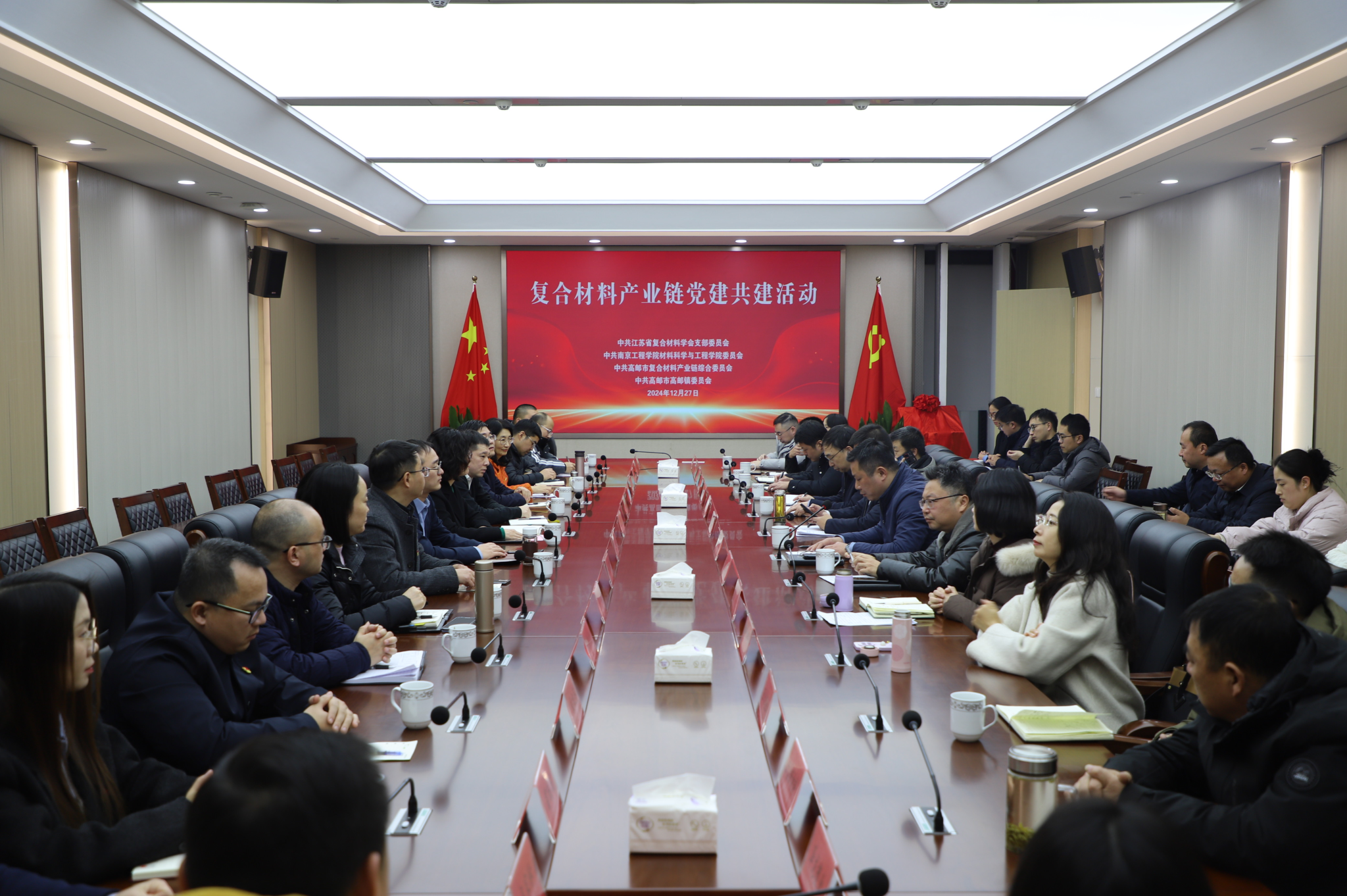 为充分发挥专业学科优势,精准赋能地方材料产业链的高质量发展,12月27日下午,材料科学与凯发党委携手江苏省复合材料学会党支部共赴高邮市,与高邮市复合材料产业链综合党委开展“党建领航·链出新材”党建联盟主题活动。高邮市副市长周振中,高邮镇镇长黄晓帅、副书记黎鹏,复合材料产业链综合党委书记李志国,江苏省复合材料学会党支部书记耿杰,材料科学与凯发党委班子、教工党支部书记、各专业负责人和企业代表参加活动,活动由黄晓帅主持。